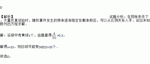 在一个不透明的布袋中装有50个黄、白两种颜色的球,除颜色外其他都相同,小红通过多次摸球试验后发现,摸到黄球的频率稳定在0.3左右,则布袋中白球可能有( )