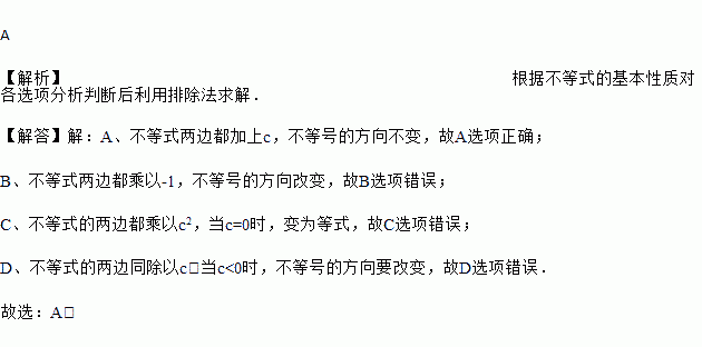 A. c+a<c+b B. c-a<c-b C. ac2<bc2 D. ![]()