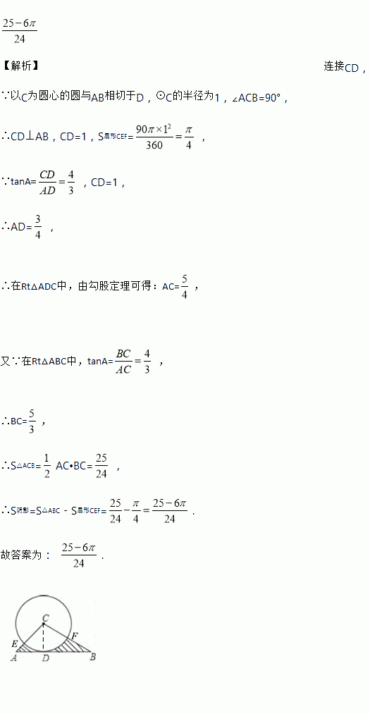 ,以C为圆心的圆与AB相切于D.若圆C的半径为1,则阴影部分的面积S=_____.