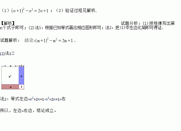 (1);(2)验证过程见解析. 【解析】试题分析:(1)按规律写出第n个式子即可;(2)法1:根据已知等式画出相应图形即可;法2:把(1)中左边化简即可得证. 试题解析: . (2)法1: 法2:等式左边=n2+2n+1-n2=2n+1=右 所以,左边=右边,结论成立。列方程组解应用题