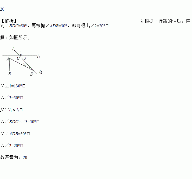 如图,已知l1∥l2,直线l与l1、l2相交于C、D两点,把一块含30°角的三角尺按如图位置摆放.若∠1=130°,则∠2=_____°.