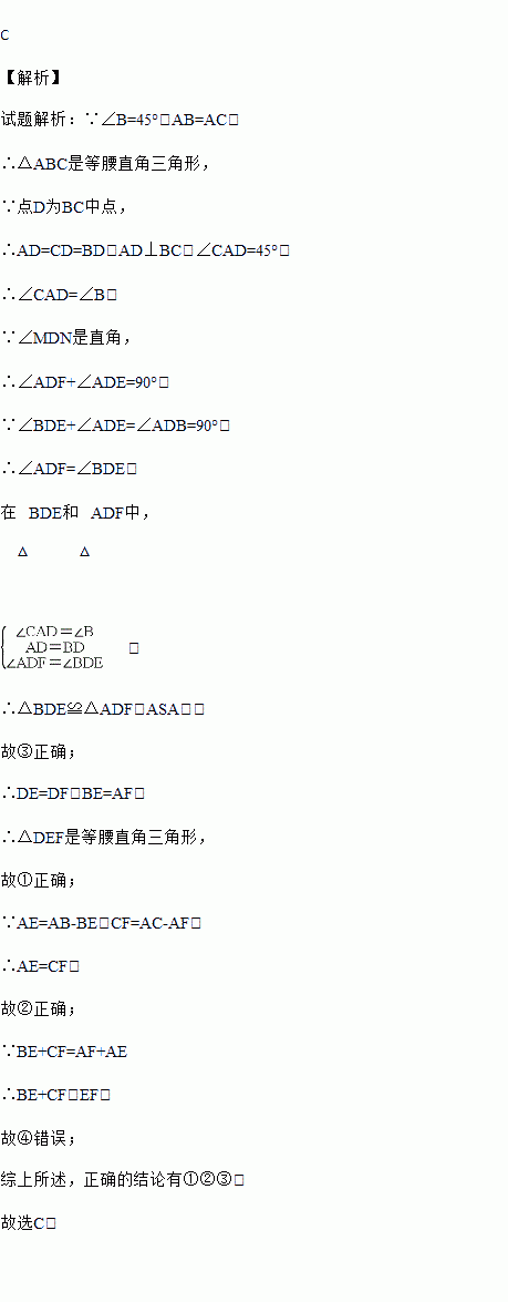 如图,在Rt△ABC中,∠BAC=90°,AB=AC,点D为BC的中点,直角∠MDN绕点D旋转,DM,DN分别与边AB,AC交于E,F两点,下列结论:①△DEF是等腰直角三角形;②AE=CF;③△BDE≌△ADF;④BE+CF=EF,其中正确结论是( )