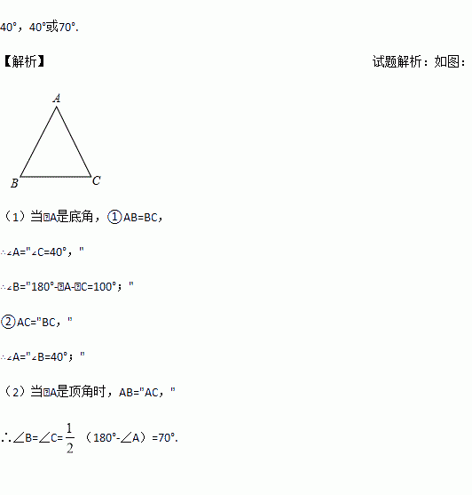 等腰三角形ABC中,∠A=40°,则∠B=_________ °