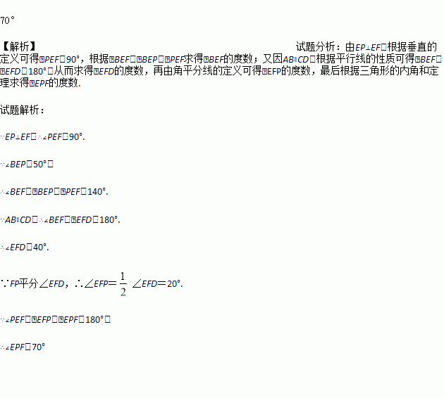 如图,已知AB∥CD,EF与AB,CD分别相交于点E,F,EP⊥EF,与∠EFD的平分线FP相交于点P,且∠BEP=50°,求∠EPF的度数.