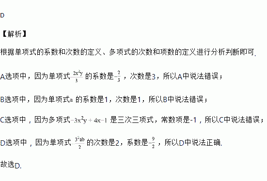 D. 单项式的次数是2,系数为