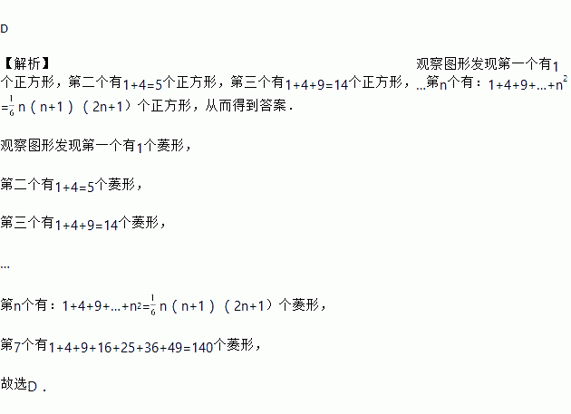 如下图,每一幅图中均含有若干个菱形,第①幅图中含有1个菱形;第②幅图中含有5个菱形;……按这样的规律下去,则第⑦幅图中含有的菱形的个数为( )