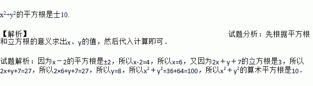 已知x-2的平方根是±2,2x+y+7的立方根是3,求x2+y2的平方根