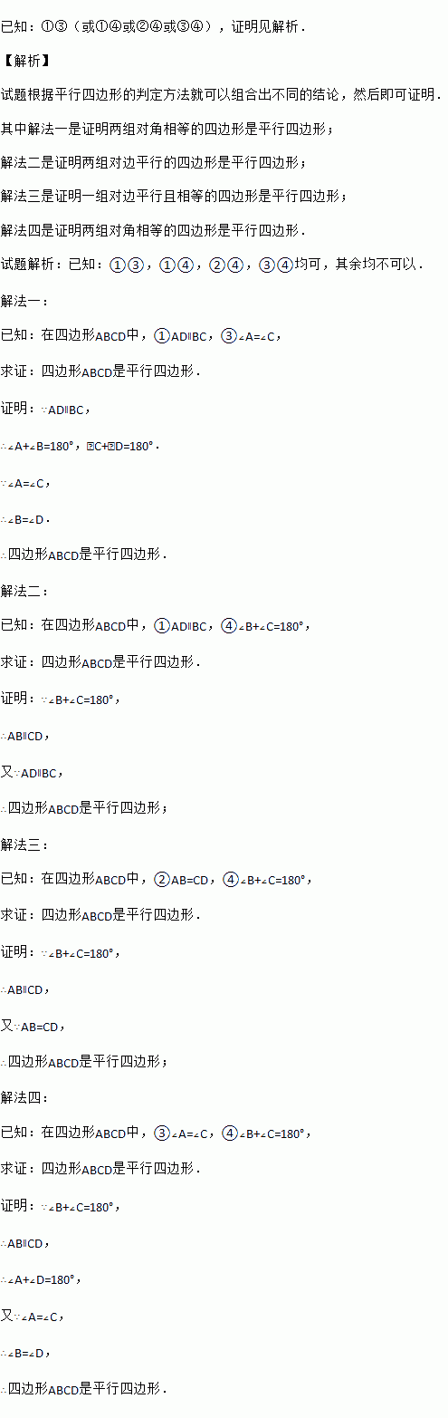 关系:①AD∥BC,②AB=CD,③∠A=∠C,④∠B+∠C=180°.