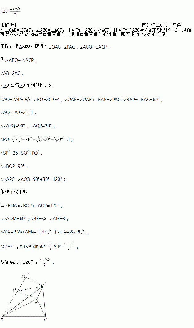 如图,△ABC中∠BAC=60°,AB=2AC.点P在△ABC内,且PA=,PB=5,PC=2,则∠APC的度数为_____,△ABC的面积为_____.