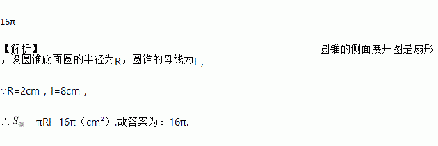 16π 【解析】圆锥的侧面展开图是扇形,设圆锥底面圆的半径为R,圆锥的母线为l, ∵R=2cm,l=8cm, ∴=πRl=16π(cm²).故答案为:16π.