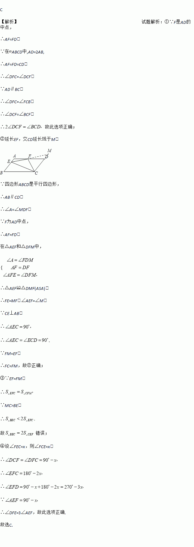 如图,在?ABCD中,AD=2AB,F是AD的中点,作CE⊥AB,垂足E在线段AB上,连接EF、CF,则下列结论:(1)2∠DCF=∠BCD,(2)EF=CF;(3)S△BEC=2S△CEF;(4)∠DFE=3∠AEF.