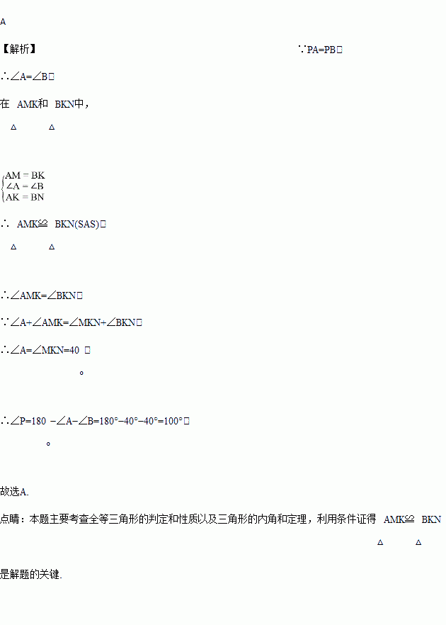 如图,在△PAB中,PA=PB,M,N,K分别是PA,PB,AB上的点,且AM=BK,BN=AK,若∠MKN=40°,则∠P的度数为( )