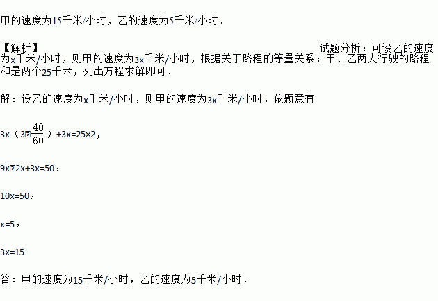甲、乙两人同时从相距25千米的A地去B地,甲骑车乙步行,甲的速度是乙的速度的3倍,甲到达B地停留40分钟,然后从B地返回A地,在途中遇见乙,这时距他们出发的时间恰好3小时,求两人的速度各是多少?