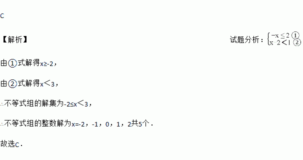 C 【解析】试题分析: 由①式解得x≥-2, 由②式解得x<3, ∴不等式组的解集为-2≤x<3, ∴不等式组的整数解为x=-2,-1,0,1,2共5个. 故选C.