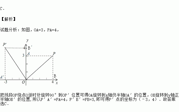 在平面直角坐标系中,线段OP的两个端点坐标分别为O(0,0),P(4, 3),将线段OP绕点O逆时针旋转90°到OP′位置,则点P′的坐标是( )