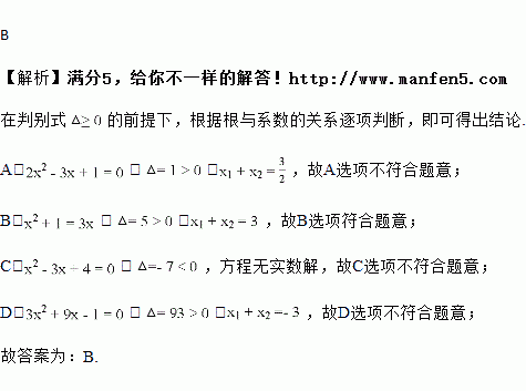 两个实根之和为的一元二次方程是( )