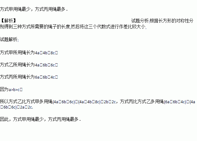 有一长方体形状的物体,它的长,宽,高分别为a,b,c(a>b>c),有三种不同的捆扎方式(如图所示的虚线).哪种方式用绳最少?哪种方式用绳最多?说明理由.
