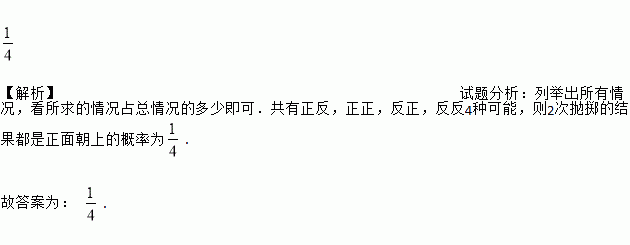 【解析】试题分析:列举出所有情况,看所求的情况占总情况的多少即可.共有正反,正正,反正,反反4种可能,则2次抛掷的结果都是正面朝上的概率为. 故答案为: .