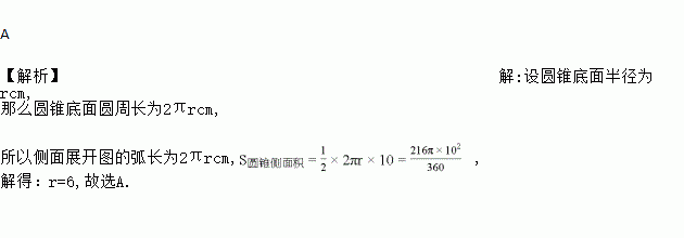 圆锥母线长为10,其侧面展开图是圆心角为216°的扇形,则圆锥的底面圆的半径为( )
