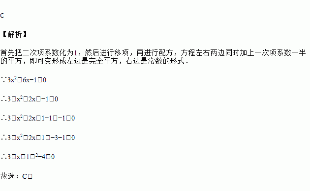 将方程3x2+6x-1=0配方,变形正确的是( )