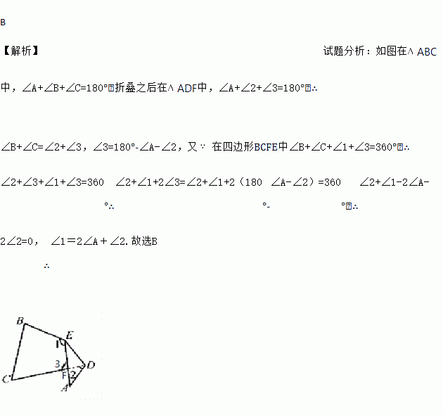 B 【解析】试题分析:如图在ABC中,∠A+∠B+∠C=180°,折叠之后在ADF中,∠A+∠2+∠3=180°,∴∠B+∠C=∠2+∠3,∠3=180°-∠A-∠2,又在四边形BCFE中∠B+∠C+∠1+∠3=360°,∴∠2+∠3+∠1+∠3=360°∴∠2+∠1+2∠3=∠2+∠1+2(180°-∠A-∠2)=360°,∴∠2+∠1-2∠A-2∠2=0,∴∠1=2∠A+∠2.故选B ...