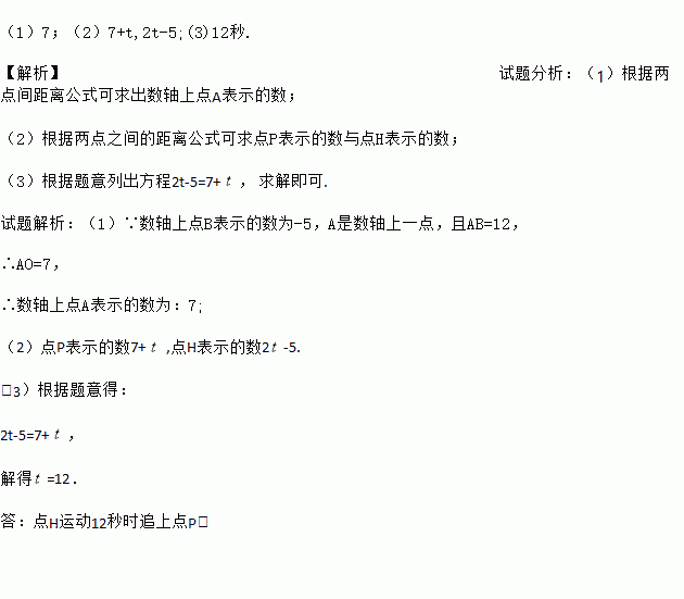 如图,已知数轴上点B表示的为-5,点A是数轴上一点,且AB=12,动点P从点A出发,以每秒1个单位长度的速度沿数轴向右匀速运动,动点H从点B出发,以每秒2个单位长度的速度沿数轴向右匀速运动,设运动时间为