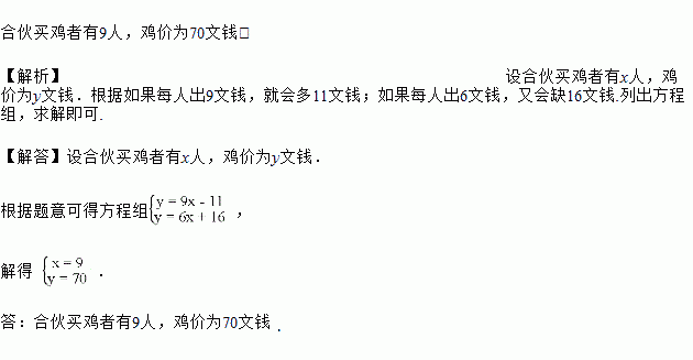 ¡¶¾ÅÕÂËãÊõ¡·ÊÇÖйú¹Å´úÊýÑ§×¨Öø£¬ÔÚÊýѧÉÏÓÐÆä¶Àµ½µÄ³É¾Í£¬²»½ö×îÔçÌáµ½ÁË·ÖÊýÎÊÌ⣬ҲÊ×ÏȼǼÁË¡°Ó¯²»×㡱µÈÎÊÌâ.ÈçÓÐÒ»µÀ²ûÊö¡°Ó¯²»×㡱µÄÎÊÌ⣬ÔÎÄÈçÏ£º½ñÓй²Âò¼¦£¬È˳ö¾Å£¬Ó¯Ê®Ò»£»È˳öÁù£¬²»×ãÊ®Áù.ÎÊÈËÊý¡¢¼¦¼Û¸÷¼¸ºÎ£¿ÒëÎÄΪ£ºÏÖÓÐÈô¸ÉÈ˺ϻï³öÇ®Âò¼¦£¬Èç¹ûÿÈ˳ö9ÎÄÇ®£¬¾Í»á¶à11ÎÄÇ®£»Èç¹ûÿÈ˳ö6ÎÄÇ®£¬ÓÖ»áȱ16ÎÄÇ®.ÎÊÂò¼¦µÄÈËÊý¡¢¼¦µÄ¼Û¸ñ¸÷ÊǶàÉÙ£¿Çë½â´ðÉÏÊöÎÊÌâ.