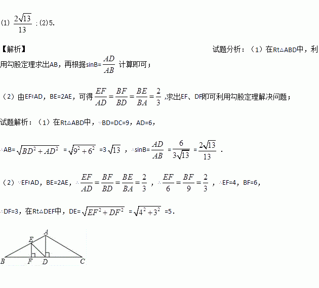 (2)现需要加装支架DE、EF,其中点E在AB上,BE=2AE,且EF⊥BC,垂足为点F,求支架DE的长.