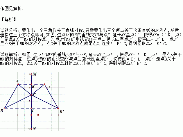 ÈçͼËùʾ£¬ÒÑÖª¡÷ABCºÍÖ±ÏßMN£®Çó×÷£º¡÷A¡äB¡äC£¬Ê¹¡÷A¡äB¡äCºÍ¡÷ABC¹ØÓÚÖ±ÏßMN¶Ô³Æ£®£¨²»ÒªÇóд×÷·¨£¬Ö»±£Áô×÷ͼºÛ¼££©