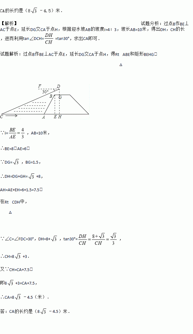 米,BG=1.5米,BG平行于AC所在的直线,迎水坡i=4:3,坡长AB=10米,点A、B、C、D、F、G在同一平面内,则此时小船C到岸边的距离CA的长是多少?(结果保留根号)