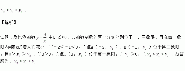 (3分)已知点A(﹣2,),B(﹣1,)和C(3,)都在反比例函数的图象上,则,,的大小关系为 .(用“<”连接)