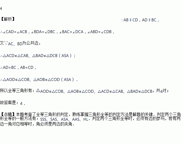 如图,AB∥CD,AD∥BC,则图中共有全等三角形_________ 对.