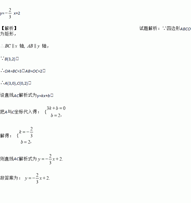 矩形ABCD在平面直角坐标系中,且顶点O为坐标原点,已知点B(3,2),则对角线AC所在的直线l对应的解析式为 _____
