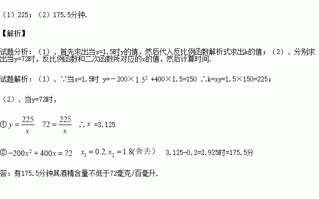 (1)求k的值.(2)假设某驾驶员晚上在家喝完半斤低度白酒,求有多长时间其酒精含量不低于72毫克/百毫升?(用分钟表示)