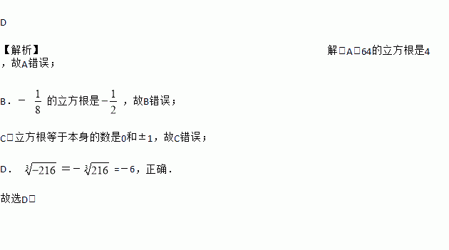 A. 64的立方根是±4 B. -没有立方根 C. 立方根等于本身的数是0 D. =-