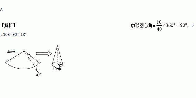 现有一张圆心角为108°,半径为40cm的扇形纸片,小红剪去圆心角为θ的部分扇形纸片后,将剩下的纸片制作成一个底面半径为10cm的圆锥形纸帽(接缝处不重叠),则剪去的扇形纸片的圆心角θ为 度