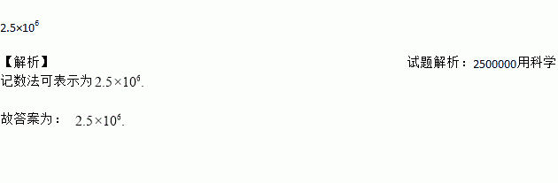 2.5×106 【解析】试题解析:2500000用科学记数法可表示为 故答案为: