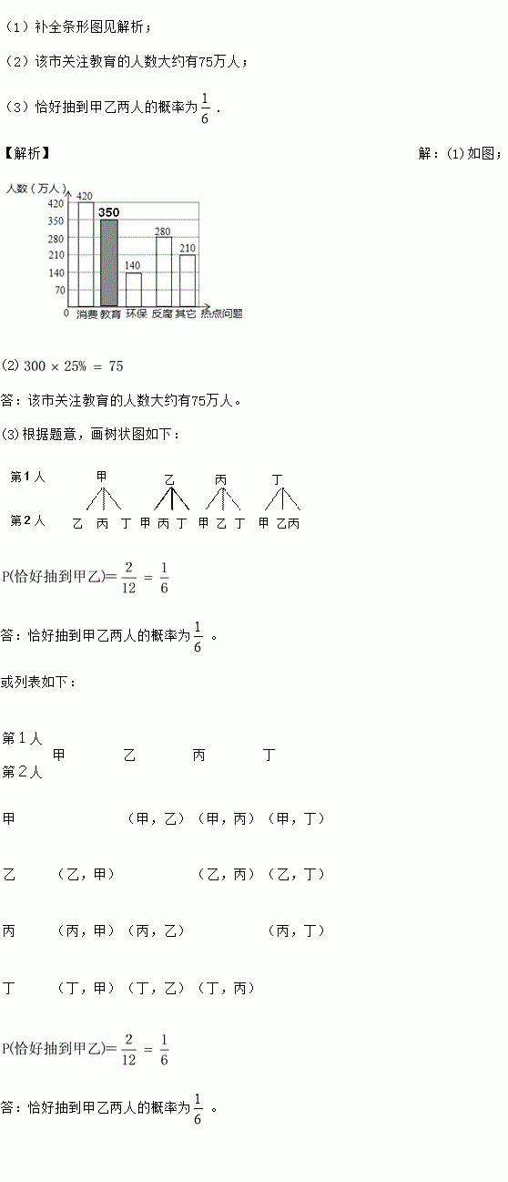 (3)在这次调查中,某单位共有甲、乙、丙、丁四人最关注教育问题,现准备从这四人中随机抽取两人进行座谈,请用列表法或树形图法表示抽取的两人恰好是甲和乙的概率.
