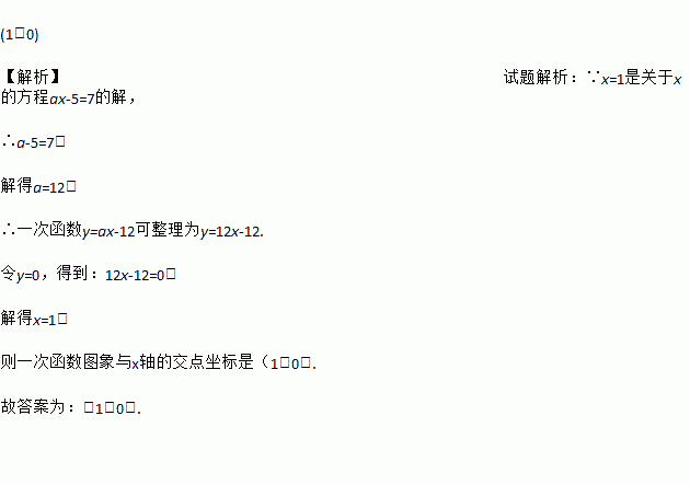 (1,0) 【解析】试题解析:∵x=1是关于x的方程ax-5=7的解, ∴a-5=7, 解得a=12, ∴一次函数y=ax-12可整理为y=12x-12. 令y=0,得到:12x-12=0, 解得x=1, 则一次函数图象与x轴的交点坐标是(1,0). 故答案为:(1,0).
