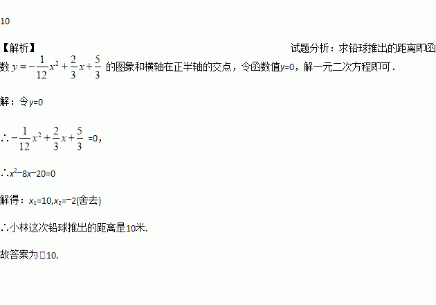 校运动会铅球比赛时,小林推出的铅球行进的高度y(米)与水平距离x(米)满足关系式,则小林这次铅球推出的距离是___________米.