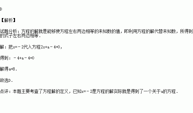 方程2x+a﹣4=0的解是x=﹣2,则a等于( )