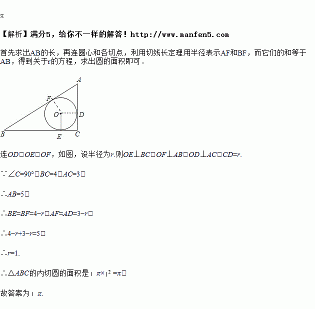 的内切圆的面积是________.![]()