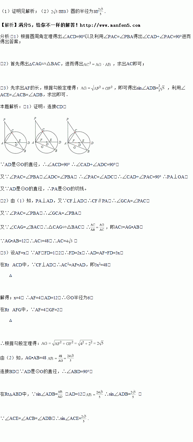 (3)在满足(2)的条件下,若AF:FD=1:2,GF=1,求⊙O的半径及sin∠ACE的值.