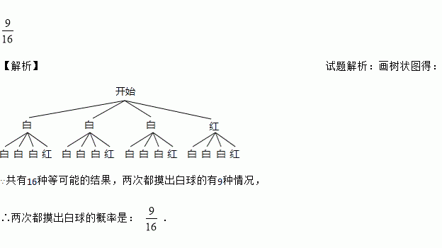 在一个不透明的袋子中,有3个白球和1个红球,它们只有颜色上的区别,从袋子中随机摸出一个球记下颜色放回,再随机地摸出一个球,则两次都摸到白球的概率为______ .