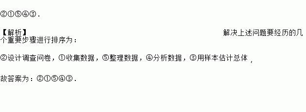 ②①⑤④③. 【解析】解决上述问题要经历的几个重要步骤进行排序为: ②设计调查问卷,①收集数据,⑤整理数据,④分析数据,③用样本估计总体, 故答案为:②①⑤④③.