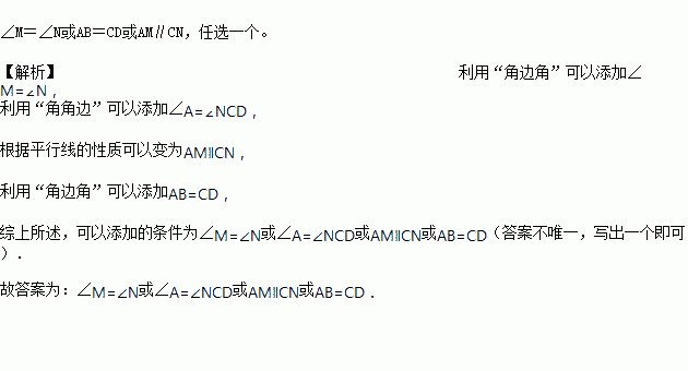 如图,已知B、C在线段AD上,且MB=ND,∠=∠,请你添加一个条,使△ABM≌△CDN,你添加的条件是____。