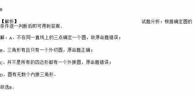 C. 四边形都有一个外接圆 D. 圆有且只有一个内接三角形