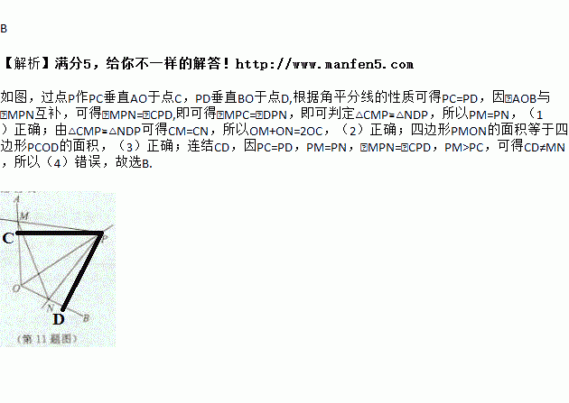 如图,点P为定角∠AOB的平分线上的一个定点,且∠MPN与∠AOB互补,若∠MPN在绕点P旋转的过程中,其两边分别与OA、OB相交于M、N两点,则以下结论:(1)PM=PN恒成立;(2)OM+ON的值不变;(3)四边形PMON的面积不变;(4)MN的长不变,其中正确的个数为( )