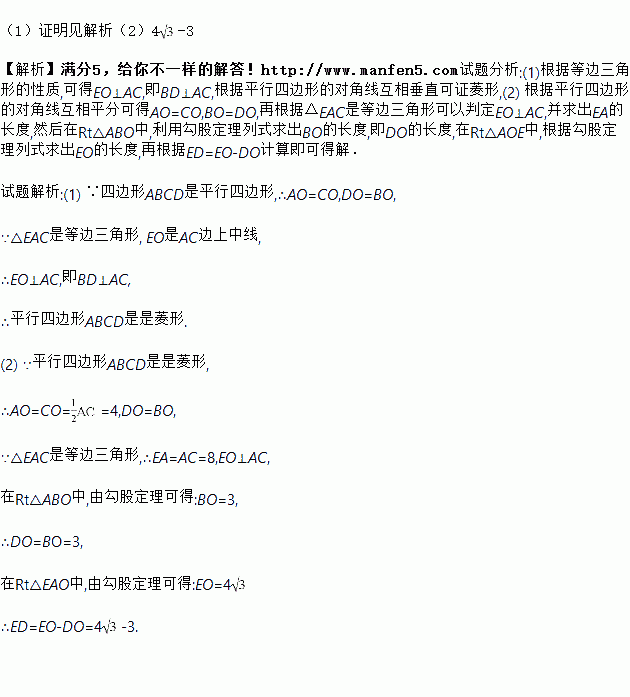如图,在□ABCD中,对角线AC、BD相交于点O,点E在BD的延长线上,且△EAC是等边三角形.