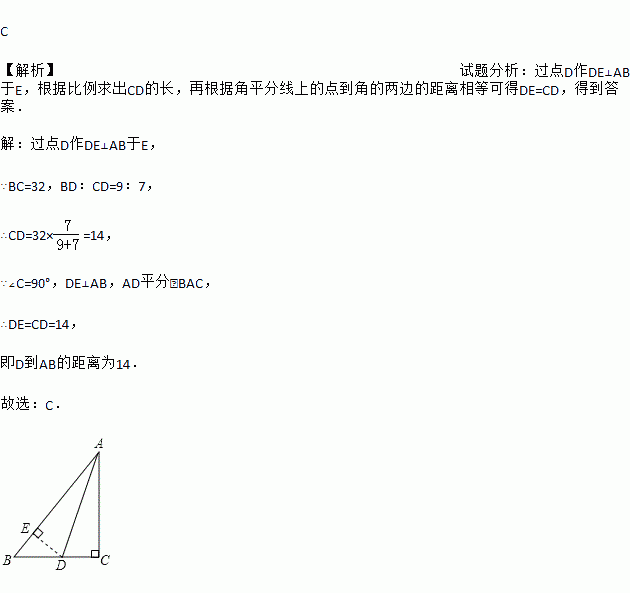 C 【解析】试题分析:过点D作DE⊥AB于E,根据比例求出CD的长,再根据角平分线上的点到角的两边的距离相等可得DE=CD,得到答案. 【解析】 过点D作DE⊥AB于E, ∵BC=32,BD:CD=9:7, ∴CD=32×=14, ∵∠C=90°,DE⊥AB,AD平分∠BAC, ∴DE=CD=14, 即D到AB的距离为14. 故选:C.